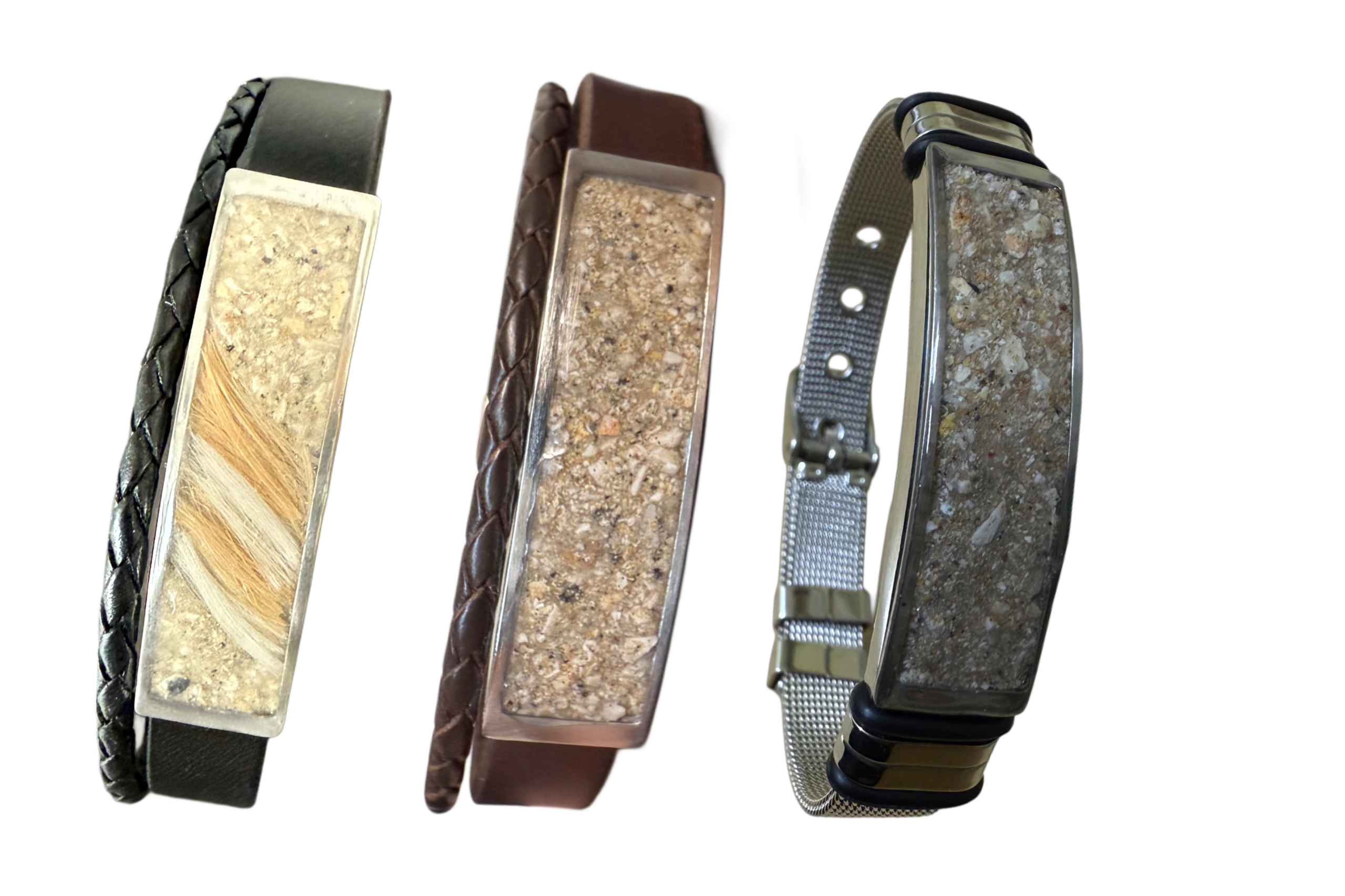 Das Armband kann mit Asche oder Haaren personalisiert werden und wird in liebevoller, regionaler Handarbeit hergestellt. Zudem sind Blattgoldflocken in den Farben gold, silber und rosé möglich. Da kein Stück dem anderen gleicht, ist jedes Stück ein Unikat – hier sehen Sie Symbolbilder.