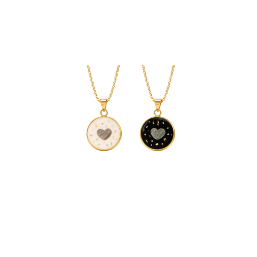 Der Anhänger ist mit Haaren in Herzform personalisiert, mit Blattgoldflocken verziert und wird in liebevoller Handarbeit hergestellt. Da kein Stück dem anderen gleicht, ist jedes Stück ein Unikat – hier sehen Sie Symbolbilder.