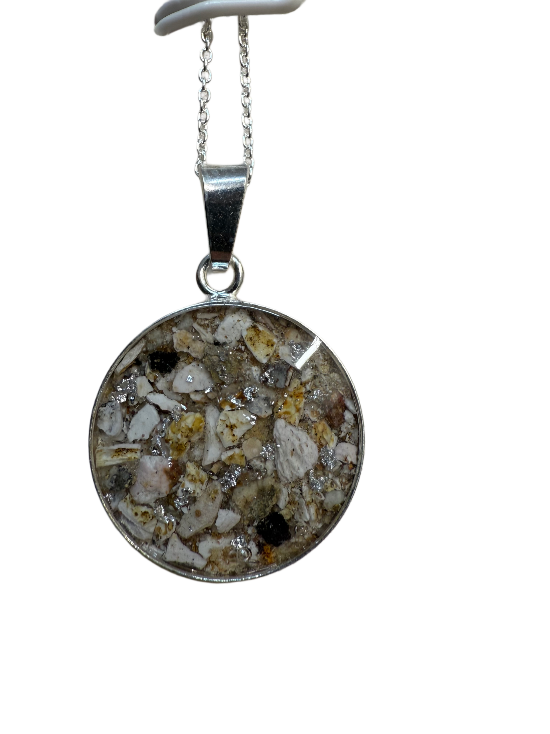 Der hier gezeigte Kettenanhänger Orbis ist Sterling Silber 925 und wahlweise mit 24K Gelbgold oder 18K Roségold beschichtet erhältlich. Zudem sind Blattgold-Flocken in den Farben gelbgold, silber und rosé möglich. Der Durchmesser beträgt 8, 12 oder 18 mm.