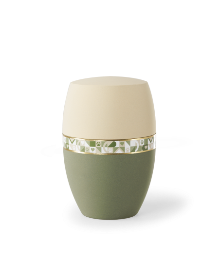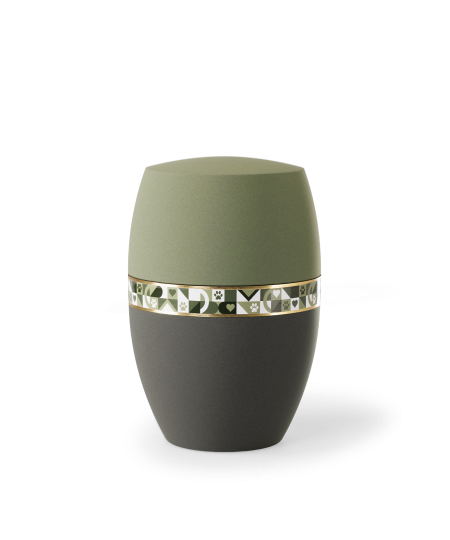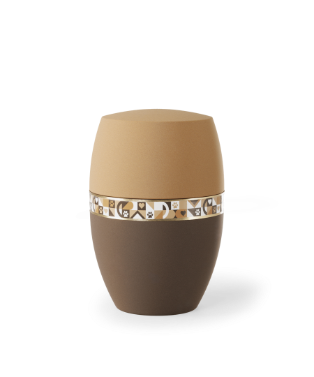 Die Urne Artista kombiniert samte Farben, die durch ein künstlerisches Pfotenband voneinander getrennt sind. Das Pfotenband selbst enthält liebevolle Herz- und Pfotensymbole.